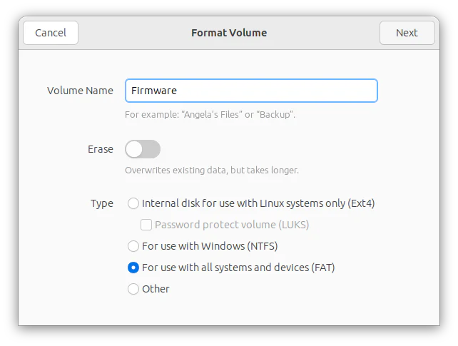 This action will delete all data on the drive. After removing the original partition, the - sign will disappear and a + sign will appear. Click the + and set the Type to FAT. You can choose any name for the Volume Name.